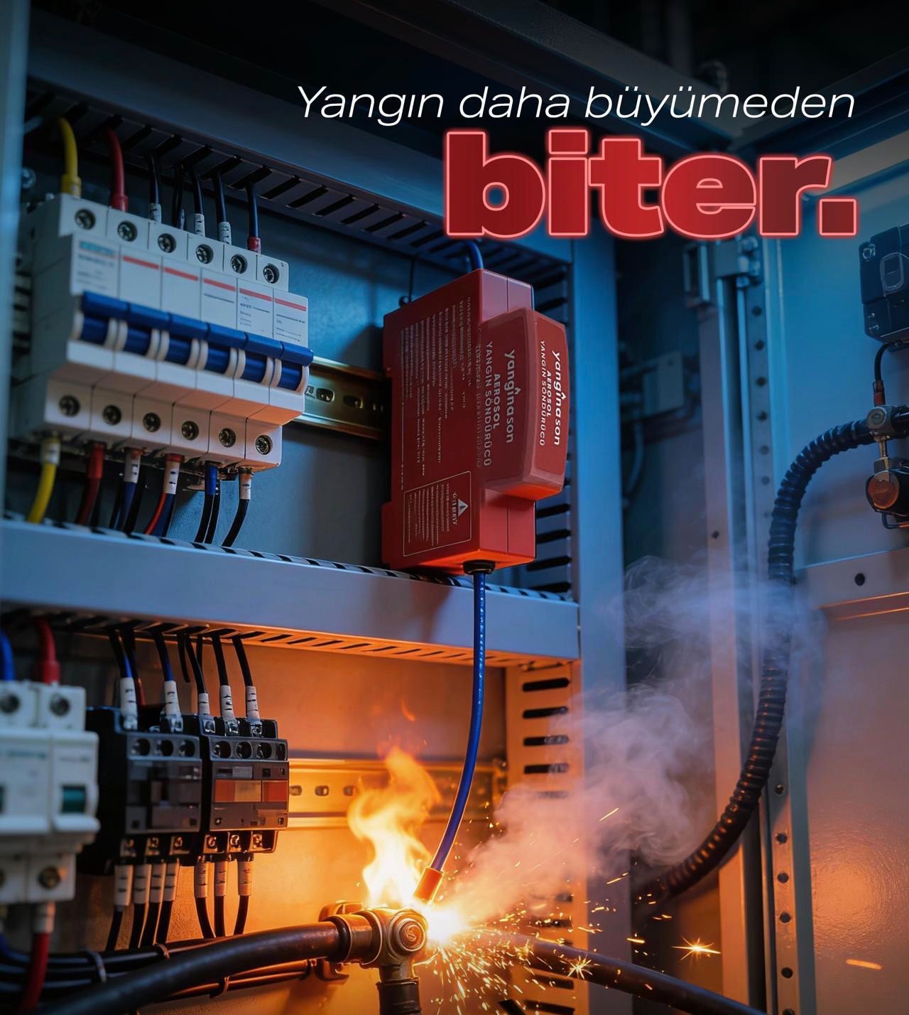 Otomatik aerosol gazlı yangın söndürme sistemi; araç motor bölmelerinde ve elektrik panolarında çıkan yangınları daha büyümeden kaynağında yok eder.